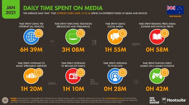 It turns out that New Zealanders spend over six and a half hours connected to the internet each day. Of that, some time is spent streaming TV, and nearly two hours is spent on social media. New Zealand teens are among the world’s most connected. These figures don’t tell us exactly what people are doing in all this connected time—they could be reading War and Peace on their tablet, or playing Grand Theft Auto—but it seems unlikely that all this online time is being invested in wholesome activities or thoughtful engagement with the world, as opposed to doom scrolling or curating a misleading social media presence.